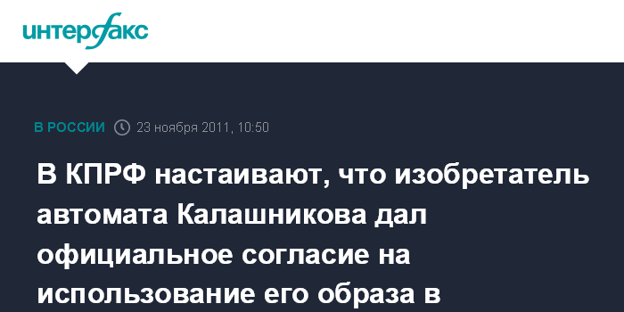 Москва. 23 ноября. INTERFAX.RU - Коммунисты обвинили "единороссов" в распространении недостоверной информации о том, что КПРФ использует в своих агитационных материалах образ и высказывания известного конструктора стрелкового оружия Михаила Калашникова без его согласия.