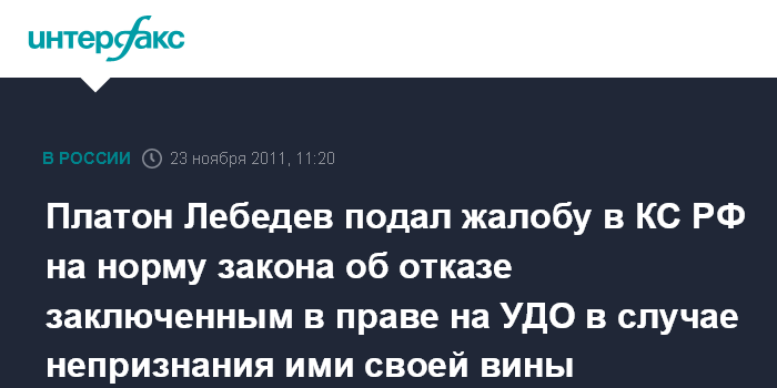 Москва. 23 ноября. INTERFAX.RU - Бывший руководитель МФО "МЕНАТЕП" Платон Лебедев оспорил в Конституционном суде РФ норму закона, позволяющую отказывать в условно-досрочном освобождении заключенному, не признавшему свою вину.