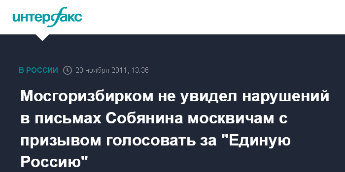Москва. 23 ноября. INTERFAX.RU - Письма от имени мэра Сергея Собянина, распространяемые по почтовым ящикам москвичам, где содержится призыв голосовать на предстоящих выборах в Госдуму за партию "Единая Россия", не противоречат избирательному законодательству.