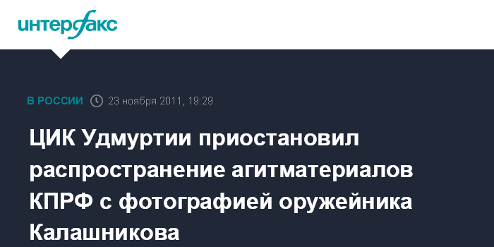 Источник агентства уточнил, что республиканский ЦИК постановил также обязать удмуртское региональное отделение КПРФ предоставить письменное согласие М.Калашникова "на использование своих высказываний и изображения в агитационных целях".