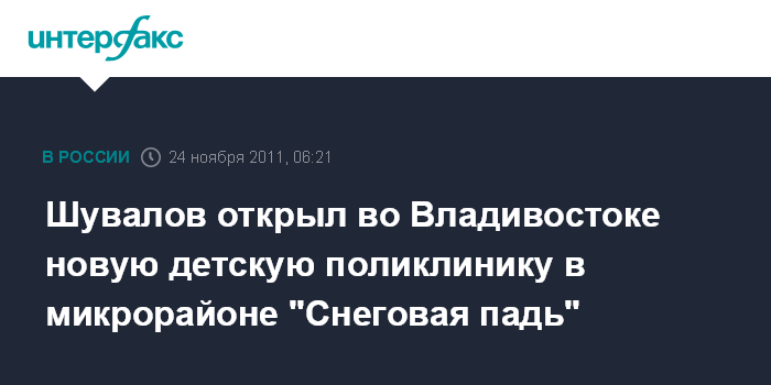 Владивосток. 24 ноября. ИНТЕРФАКС-ДАЛЬНИЙ ВОСТОК - Первый заместитель главы правительства РФ Игорь Шувалов в рамках рабочего визита в Приморье принял участие в церемонии открытия новой детской поликлиники в строящемся во Владивостоке микрорайоне для военных "Снеговая падь", сообщает в четверг его секретариат.