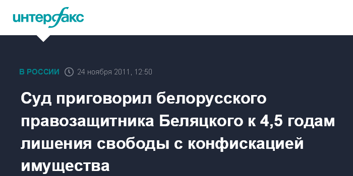 Минск. 24 ноября. INTERFAX.RU - Суд Первомайского района Минска признал белорусского правозащитника Алеся Беляцкого виновным в уклонении от уплаты налогов в особо крупном размере.