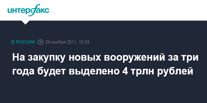 "В ближайшую трехлетку на оснащение военной организации государства и прежде всего на серийную закупку новой современной техники планируется потратить около 60% выделяемых на гособоронзаказ ресурсов, а это почти 4 трлн рублей", - сказал Иванов на заседании военно-промышленной комиссии при правительстве РФ, которая должна рассмотреть проект гособоронзаказа на 2012-2014 годы.