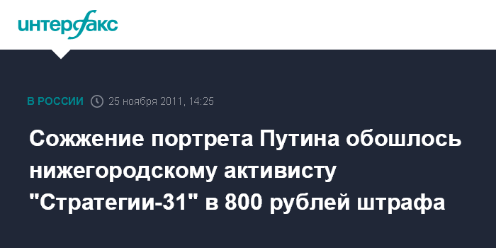 Нижний Новгород. 25 ноября. INTERFAX.RU - Мировой суд участка N1 Нижегородского района Нижнего Новгорода признал сожжение портрета председателя правительства РФ Владимира Путина на согласованном митинге "Стратегия-31" 31 октября нарушением правил проведения публичного мероприятия.