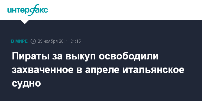 Рим. 25 ноября. INTERFAX.RU - Сомалийские пираты отпустили на свободу итальянское судно, захваченное 21 апреля этого года в Аравийском море, передают в пятницу римские СМИ.