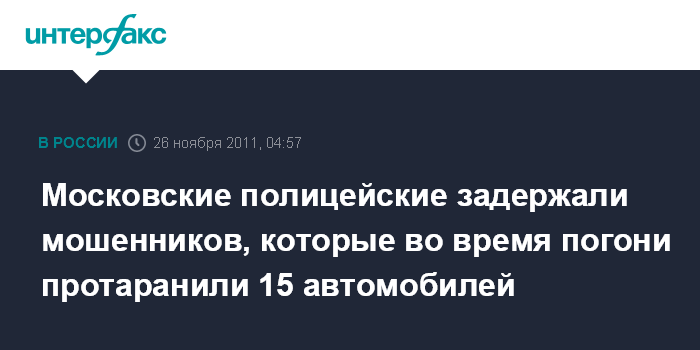 Москва. 26 ноября. ИНТЕРФАКС - Сотрудники московской полиции задержали подозреваемых в мошенничестве с кредитом, которые, пытаясь скрыться от сотрудников правоохранительных органов, протаранили 15 машин, сообщили "Интерфаксу" в пресс-службе столичного ГУ МВД РФ.
