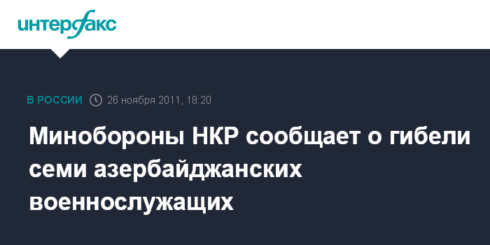 Ереван. 26 ноября. INTERFAX.RU - Министерство обороны непризнанной Нагорно-Карабахской республики сообщает, что в результате мер, принятых в ответ на убийство двух карабахских военнослужащих, погибли семь азербайджанских военных.