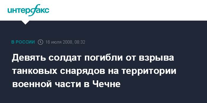 Москва. 16 июля. INTERFAX.RU - Девять российских военнослужащих погибли и шесть получили ранения в результате взрыва боеприпасов, произошедшего во вторник вечером в мотострелковом полку Минобороны РФ, дислоцирующемся в чеченском райцентре в Шали.