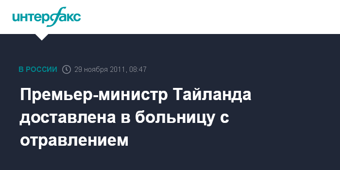 Бангкок. 29 ноября. INTERFAX.RU - Премьер-министр Тайланда Йинглак Чинават госпитализирована с симптомами пищевого отравления, сообщает тайская газета The Bangkok Post во вторник.