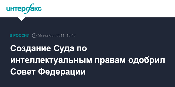 Москва. 29 ноября. INTERFAX.RU - Совет Федерации одобрил закон, предусматривающий создание Суда по интеллектуальным правам.