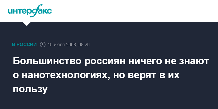 Москва. 16 июля. INTERFAX.RU - Подавляющее большинство россиян уверены, что использование нанотехнологий может принести людям пользу, при этом значительное количество граждан страны не имеет никакой информации об этих достижениях науки, отмечают социологи.