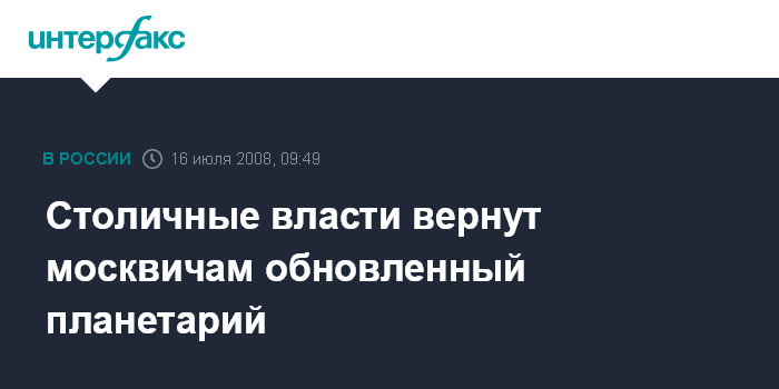 Москва. 16 июля. INTERFAX.RU - Московский планетарий, судьба которого долгое время находилась под вопросом, будет возвращен жителям российской столицы как центр познания Вселенной, сообщил мэр Москвы Юрий Лужков в эфире программы "Лицом к городу" на телеканале "ТВ Центр" во вторник.