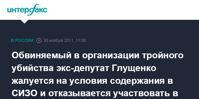 Москва. 30 ноября. INTERFAX.RU - Экс-депутат Госдумы РФ Михаил Глущенко, содержащийся в Санкт-Петербурге под стражей по обвинению в организации тройного убийства, обращается к главе Центризбиркома Владимиру Чурову с просьбой об исключении себя из списков избирателей.