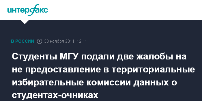 Москва. 30 ноября. INTERFAX.RU – Студенты МГУ им. Ломоносова заявляют, что подали как минимум две жалобы на действия администрации университета, не предоставившей в территориальную избирательную комиссию данные о студентах-очниках.
