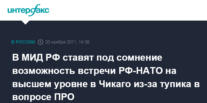 Москва. 30 ноября. INTERFAX.RU - Тупик в переговорах по ПРО ставит под вопрос возможность проведения саммита Россия-НАТО в мае в Чикаго.