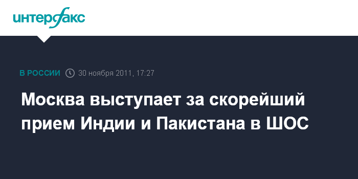 Москва. 30 ноября. INTERFAX.RU - Россия хотела бы уже в ближайшем будущем видеть Индию и Пакистан в качестве полноправных членов Шанхайской организации сотрудничества.