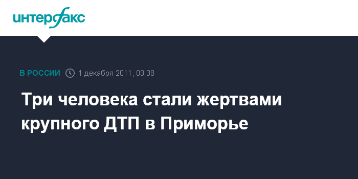 Владивосток. 1 декабря. ИНТЕРФАКС - ДАЛЬНИЙ ВОСТОК - Крупная автоавария с участием трех автомобилей на гострассе "Хабаровск-Владивосток" унесла жизни трех человек, один пострадавший находится в тяжелом состоянии.
