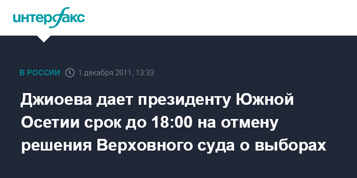 В частности, в обращении А.Джиоева требует к 18:00 мск отменить, по ее мнению, незаконное решение Верховного суда республики, признавшего выборы нелегитимными, а также отменить решение парламента о перевыборах.