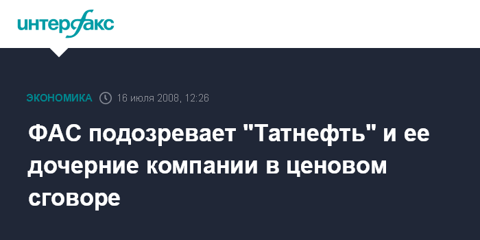 Москва. 16 июля. INTERFAX.RU - Управление Федеральной антимонопольной службы (ФАС) по республике Татарстан возбудило дело в отношении ОАО "Татнефть", ОАО "Татнефть-АЗС Центр" и ОАО "ХК "Татнефтепродукт" по признакам ценового сговора.