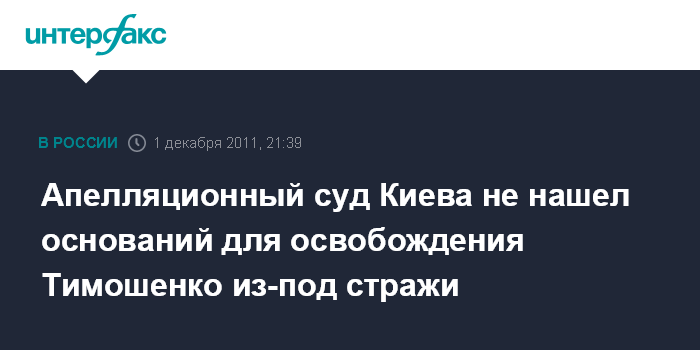 Киев. 1 декабря. INTERFAX.RU - Апелляционный суд Киева не нашел оснований для освобождения из-под стражи экс-премьера Украины Юлии Тимошенко.