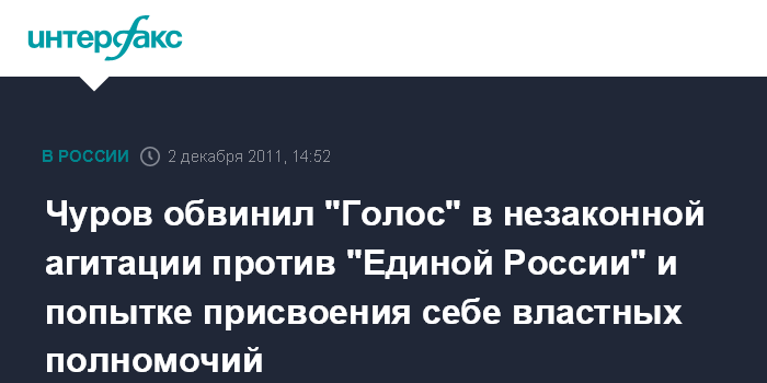 Москва. 2 декабря. INTERFAX.RU - Глава Центризбиркома РФ Владимир Чуров считает, что "Голос" незаконно агитирует против "Единой России" и пытается присвоить себе властные полномочия.