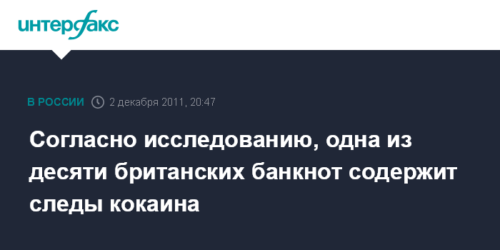 Лондон. 2 декабря. INTERFAX.RU - Каждая десятая банкнота, находящаяся в обращении в Великобритании, "отмечена" следами кокаина, сообщает в пятницу британская газета The Guardian.