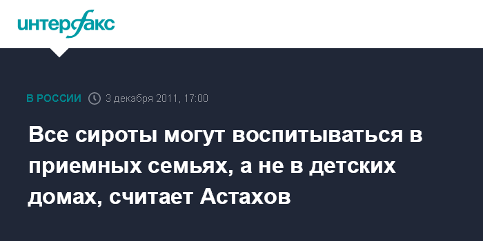 Горки. 3 декабря. INTERFAX.RU - Уполномоченный при президенте РФ по правам ребенка Павел Астахов считает, что власти страны должны поставить перед собой задачу добиться того, чтобы в России не было сирот. На встрече с главой государства Дмитрием Медведевым, в которой также принял участие генпрокурор Юрий Чайка, П.Астахов выразил мнение, что все дети-сироты должны оказаться в семьях.