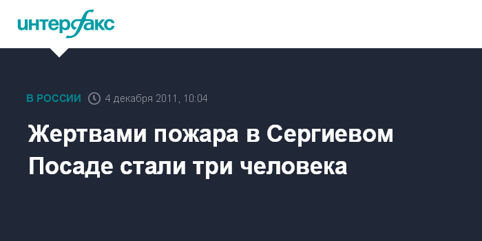 Москва. 4 декабря. INTERFAX.RU - Три человека погибли, еще один получил различные травмы в результате пожара в Сергиевом Посаде, сообщили "Интерфаксу" в пресс-службе ГУ МЧС России по Московской области в воскресенье.