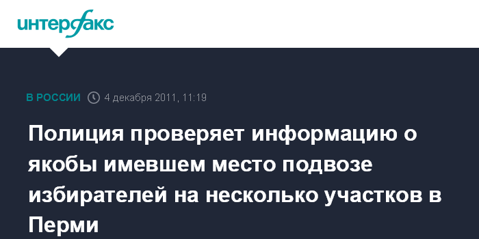 Пермь. 4 декабря. INTERFAX.RU - Представители пермской полиции проверяют поступившую информацию от одной из избирательниц о якобы имевшем место подвозе избирателей на несколько избирательных участков в Перми.