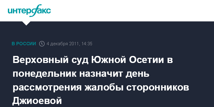 Ранее в пятницу доверенное лицо А.Джиоевой Анатолий Баранкевич сообщил, что Верховный суд Южной Осетии в понедельник начнет рассматривать жалобу сторонников А.Джиоевой на отмену результатов президентских выборов.