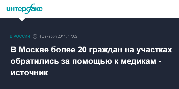 Москва. 4 декабря. INTERFAX.RU - С начала голосования на избирательных участках Москвы за помощью к медикам обратилось 23 жителя города, сообщил "Интерфаксу" источник в медицинских кругах столицы в воскресенье.