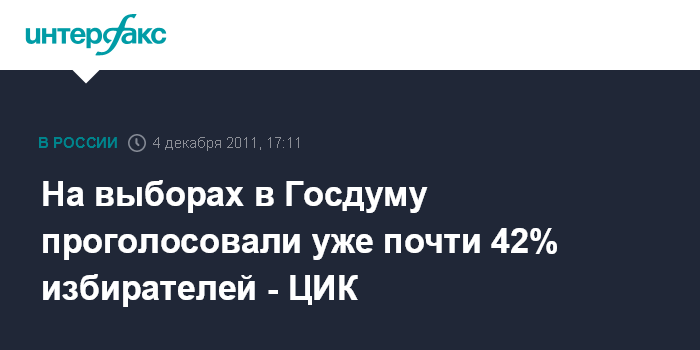 Москва. 4 декабря. ИНТЕРФАКС - Явка избирателей на выборах депутатов Госдумы, по последним данным, составляет 41,9%, сообщил замглавы Центризбиркома Станислав Вавиловю "Явка растет практически по всем регионам, где идет голосование", - сказал он. По его словам, эти показатели приближаются к тем, что были на прошлых выборах в Госдуму в 2007 году.