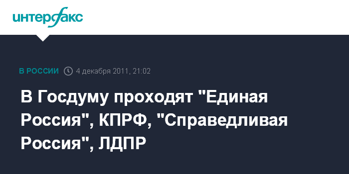 Москва. 4 декабря. INTERFAX.RU - Согласно неофициальному опросу избирателей на выходе с участков (exit-poll), проведенному ВЦИОМ по заказу Агентства политических и экономических коммуникаций, в Госдуму 6-го созыва проходят четыре партии.