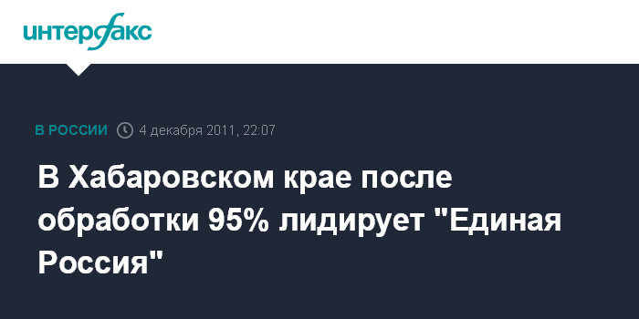 Хабаровск.4 декабря. INTERFAX.RU - В Хабаровском крае обработано 95% бюллетеней, "Единая Россия" набрала 37,62% голосов.