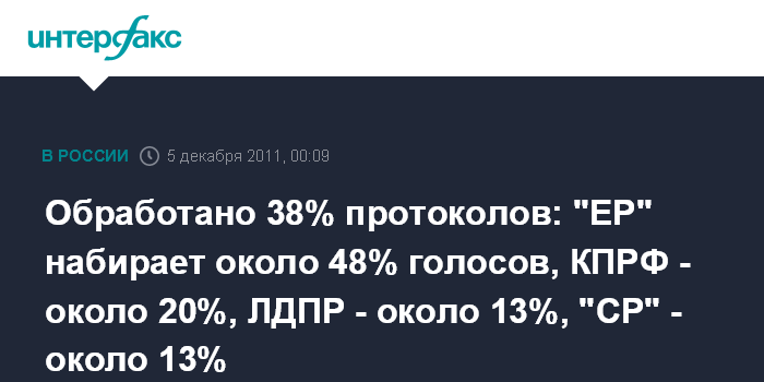 Обработано 38% протоколов: "ЕР" набирает около 48% голосов, КПРФ - около 20%, ЛДПР - около 13%, "СР" - около 13%