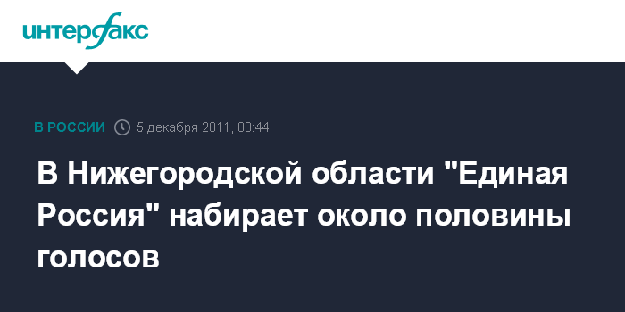 Нижний Новгород. 4 декабря. INTERFAX.RU - По результатам обработки 23% протоколов в Нижегородской области на выборах в российский парламент лидирует "Единая Россия" с результатом 49, 33%.