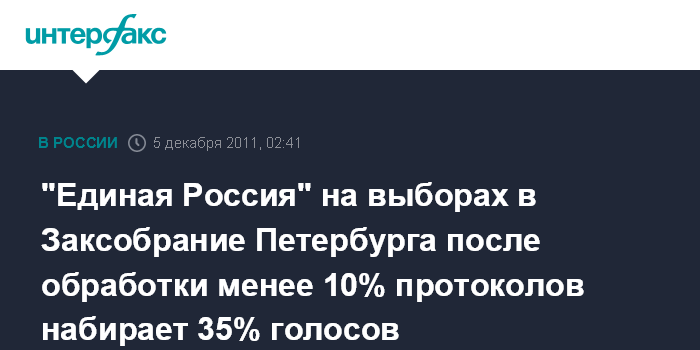Санкт-Петербург. 5 декабря. INTERFAX.RU - "Единая Россия" лидирует по итогам обработки небольших процентов протоколов голосования в Петербурге на выборах и в Госдуму, и в Заксобрание, но отрыв от преследователей значительно меньше, чем в целом по стране