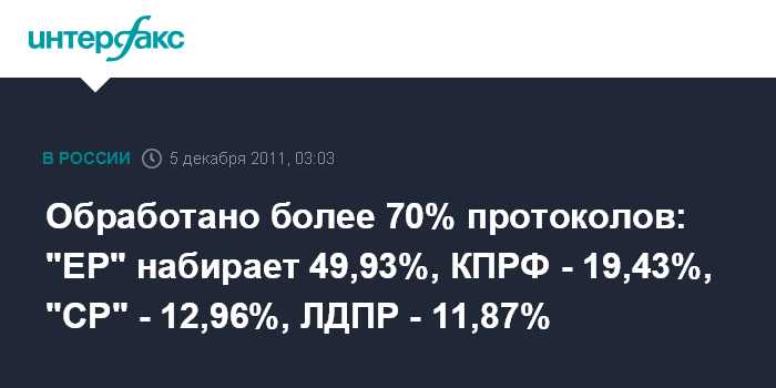 Москва. 5 декабря. INTERFAX.RU - По предварительной информации, после обработки 70,36% протоколов "Единая Россия" набирает 49,93% голосов, КПРФ - 19,43%, "Справедливая Россия" - 12,97%, ЛДПР - 11,87%.