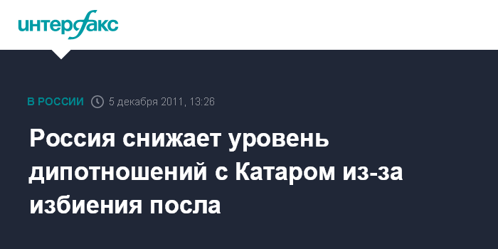 Москва. 5 декабря. INTERFAX.RU - Россия понижает уровень дипотношений с Катаром после инцидента с избиением российского посла в этой стране в конце ноября, заявили в МИД РФ.