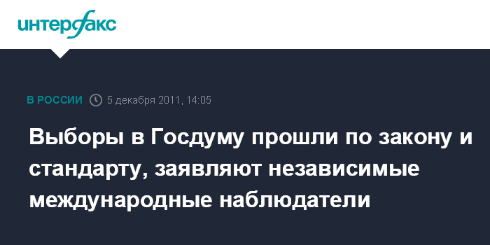 Москва. 5 декабря. INTERFAX.RU - Независимые международные наблюдатели считают, что прошедшие выборы в Госдуму РФ шестого созыва соответствовали избирательным стандартам.