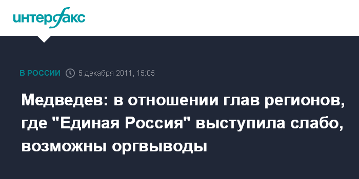 Горки. 5 декабря. INTERFAX.RU - Президент РФ Дмитрий Медведев не исключил, что сделает оргвыводы в отношении тех региональных руководителей, которые были предложены на этот пост "Единой Россией", но не смогли обеспечить партии успех на думских выборах.