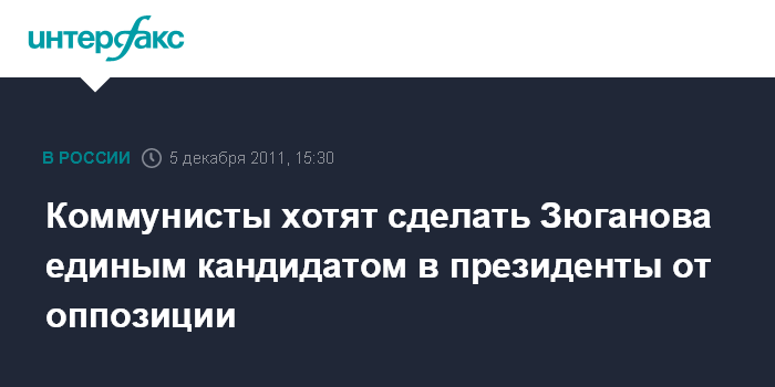 Москва. 5 декабря. INTERFAX.RU - КПРФ призывает все оппозиционные партии поддержать ее лидера Геннадия Зюганова на выборах президента России.