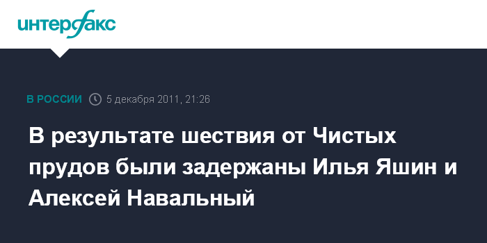 Москва. 5 декабря. INTERFAX.RU - В ходе несанкционированного шествия оппозиции от Чистых прудов в сторону Лубянки были задержаны лидер оппозиционного движения "Солидарность" Илья Яшин и блогер Алексей Навальный. "Илья Яшин и Алексей Навальный в настоящий момент находятся в полицейском автобусе", - сообщил "Интерфаксу" в понедельник координатор подмосковного отделения "Солидарность" Алексей Некрасов.