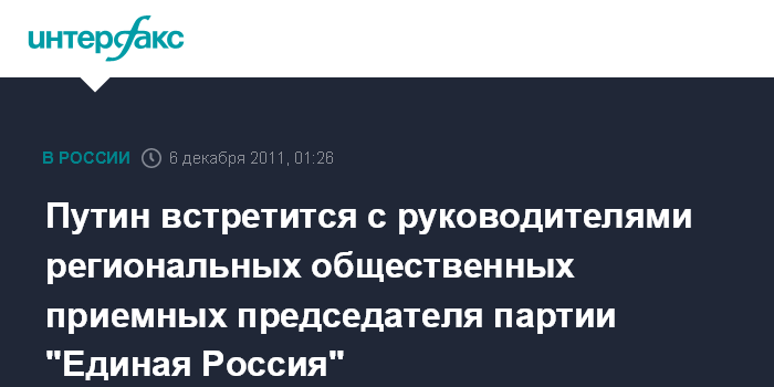 Москва. 6 декабря. ИНТЕРФАКС - Во вторник состоится рабочая встреча премьер-министра РФ Владимира Путина с руководителями региональных общественных приемных председателя партии "Единая Россия".