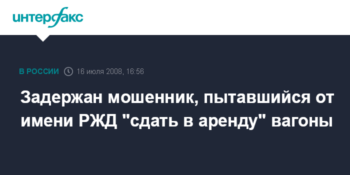Как сообщили агентству "Интерфакс-Поволжье" в пресс-службе УВД по Ульяновской области, мужчина в июле 2007 г. явился в одну из коммерческих фирм города и, представившись менеджером представителем ОАО "Российские железные дороги", предложил предпринимателям арендовать вагоны для своего бизнеса.
