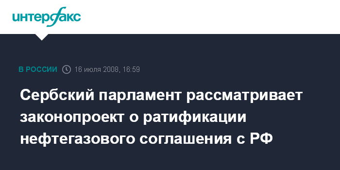 Москва. 16 июля. INTERFAX.RU - Депутаты скупщины (парламента) Сербии приступают к рассмотрению законопроекта, подтверждающего межправительственное соглашение с Россией в нефтегазовой сфере.