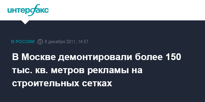 Москва. 6 декабря. INTERFAX.RU - В Москве в последние месяцы демонтировано 155 тыс. кв. метров рекламы, размещенной на строительных сетках, сообщил руководитель столичного департамента СМИ и рекламы Владимир Черников на пресс-конференции во вторник.