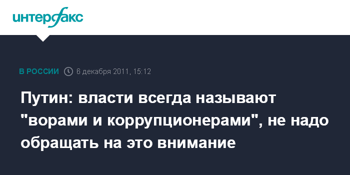 "Во-первых, не нужно обращать внимание на штампы. Вы знаете, это штампы не конкретно политической партии - вот говорят, что партия власти - это партия, связанная с воровством, с коррупцией. Если мы вспомним советские годы - кто тогда был у власти? Их всех называли ворами и коррупционерами", - заявил Путин в ходе встречи с руководителями общественных приемных председателя партии "Единая Россия".