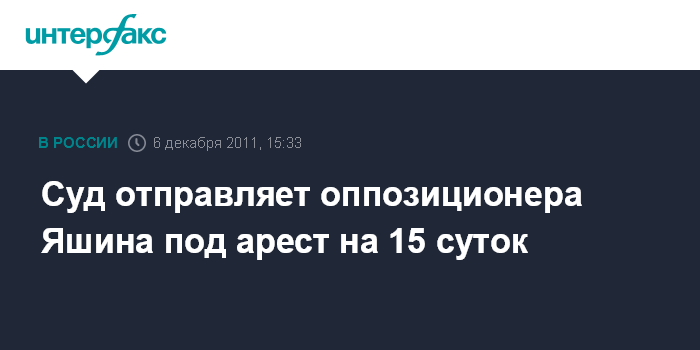 Москва. 6 декабря. INTERFAX.RU - Мировой суд Тверского района Москвы назначил оппозиционеру Илье Яшину, задержанному накануне на акции оппозиции, наказание в виде 15 суток ареста.