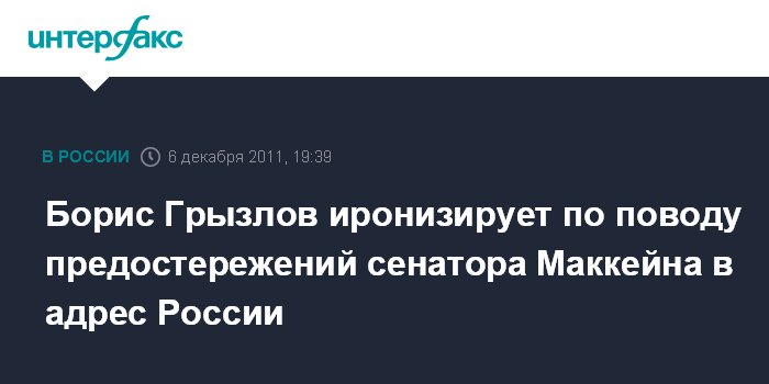 Москва. 6 декабря. INTERFAX.RU - Председатель Госдумы Борис Грызлов с иронией прокомментировал комментарии американского сенатора-республиканца Джона Маккейна, который в очередной раз предостерег руководство России от повторения "арабской весны".